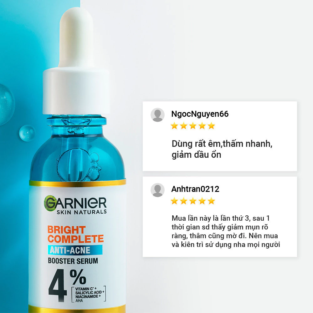 Review Garnier Bright Complete Anti-Acnes Booster Serum 4% – Serum Dưỡng Da Dầu Mụn Với Niacinamide, BHA, AHA, Vitamin C 30ml